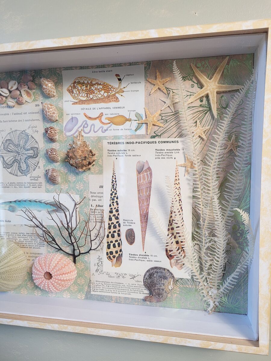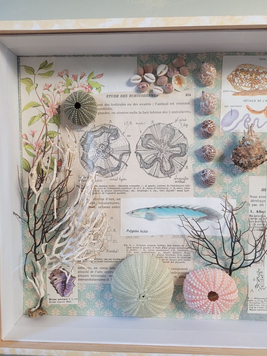Éléments naturels, coquillages, gorgone, oursins, illustrations authentiques de manuels de biologie, beaux papiers, composent ce petit univers à découvrir et re-découvrir.