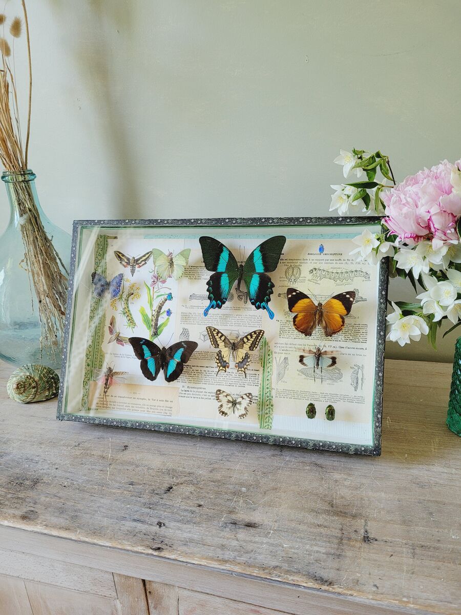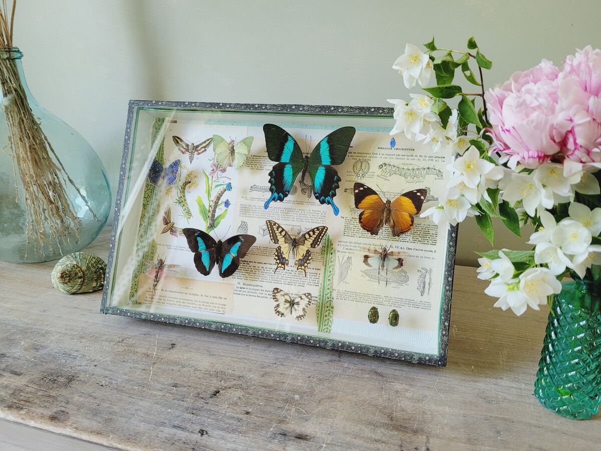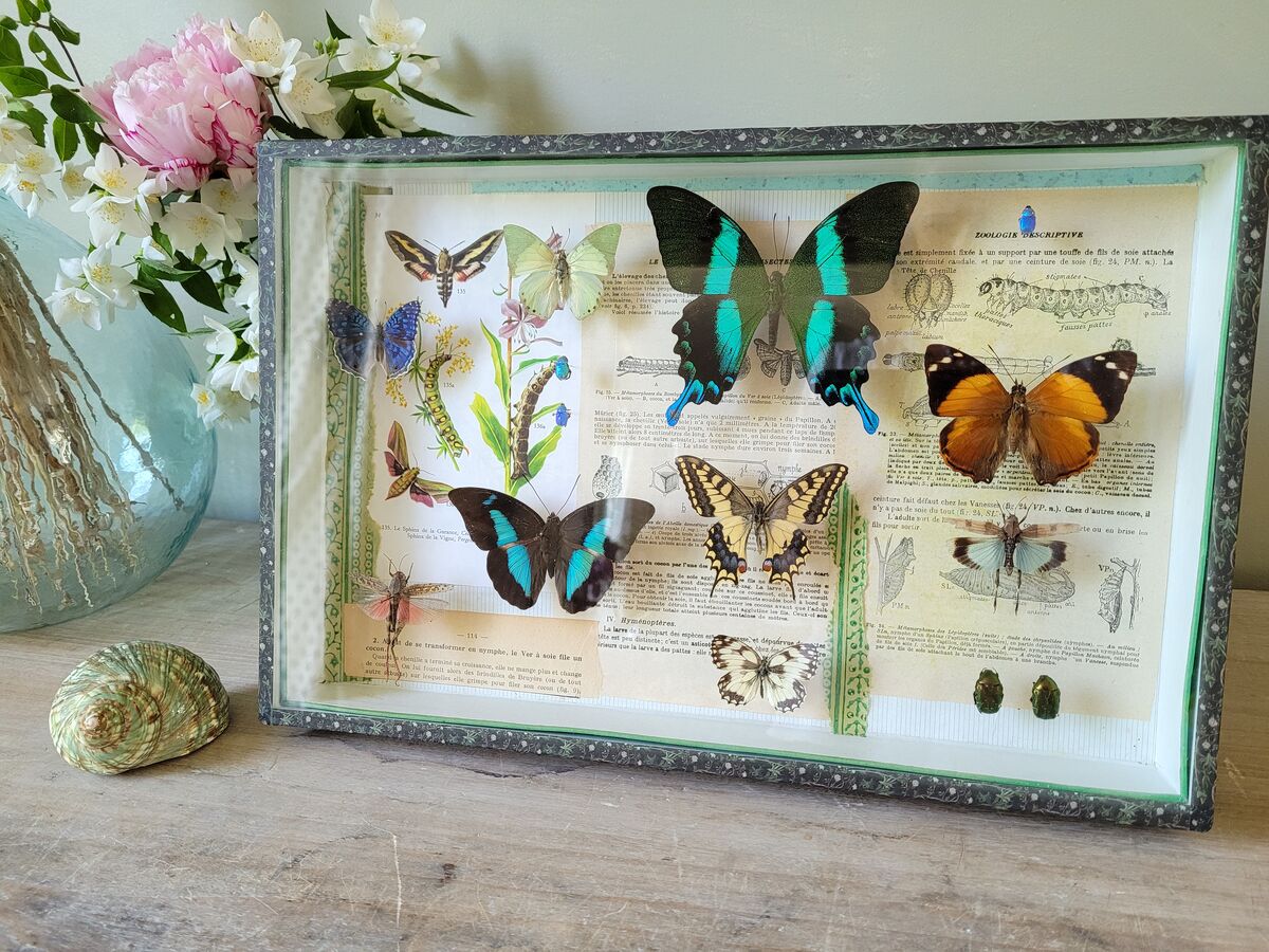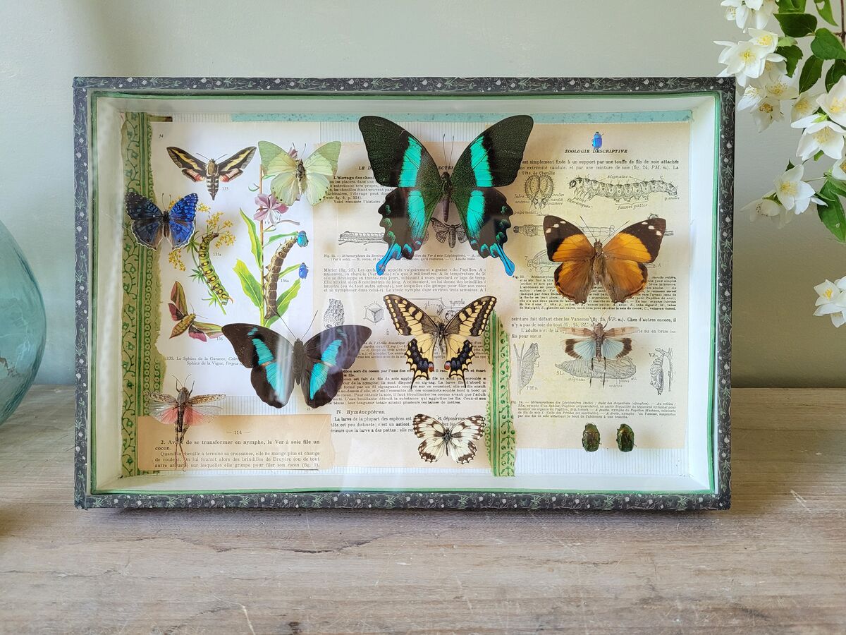 Composition unique réalisée dans une boîte entomologique ancienne.