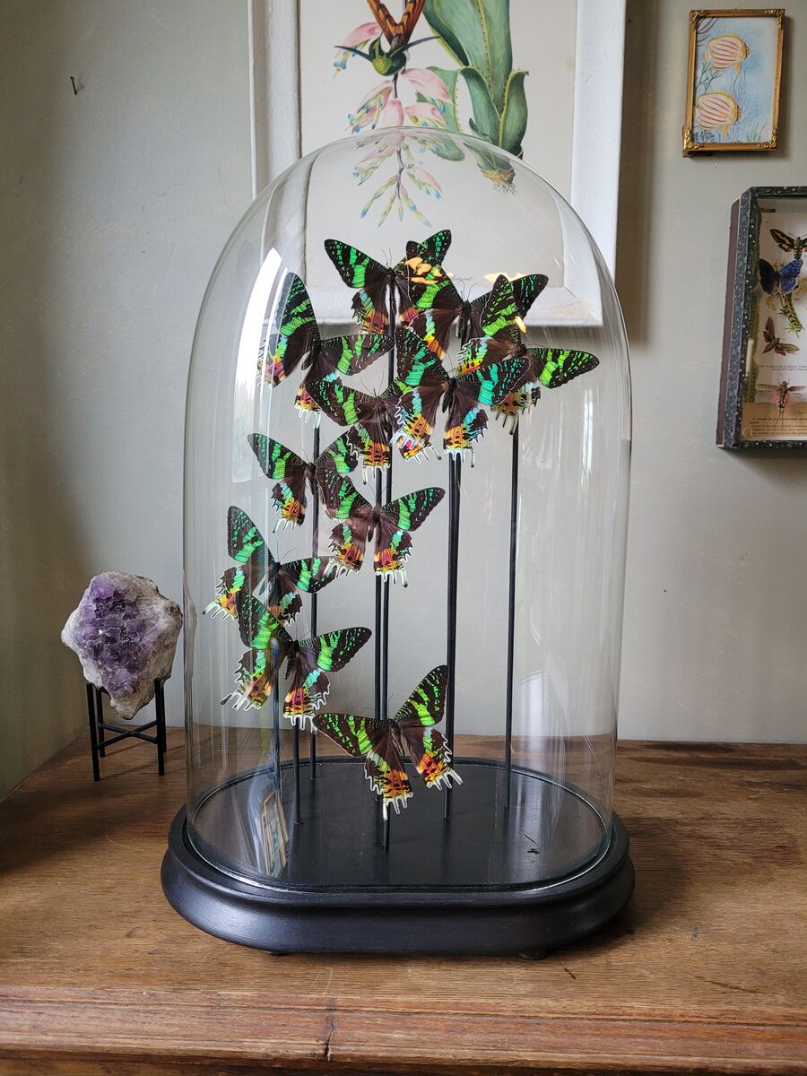 Dans un globe ancien Napoléon III, envolée de 11 papillons Urania ripheus