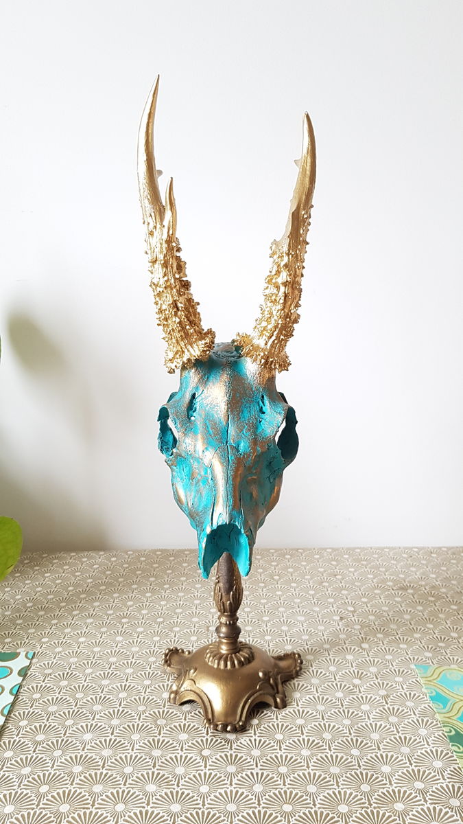 Crâne de chevreuil travaillé monté sur un socle ancien en laiton