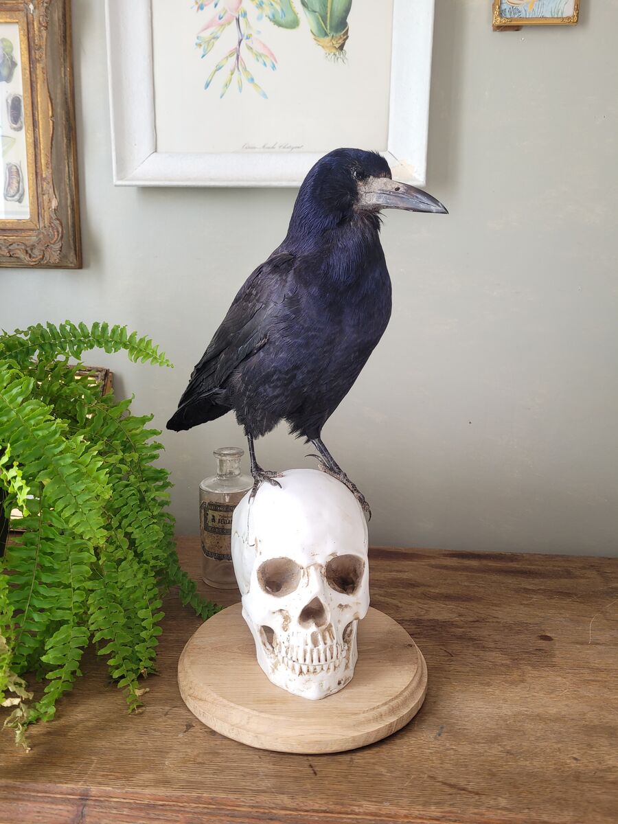 Taxidermie de corbeau freux sur réplique de crâne humain ( réplique en résine)